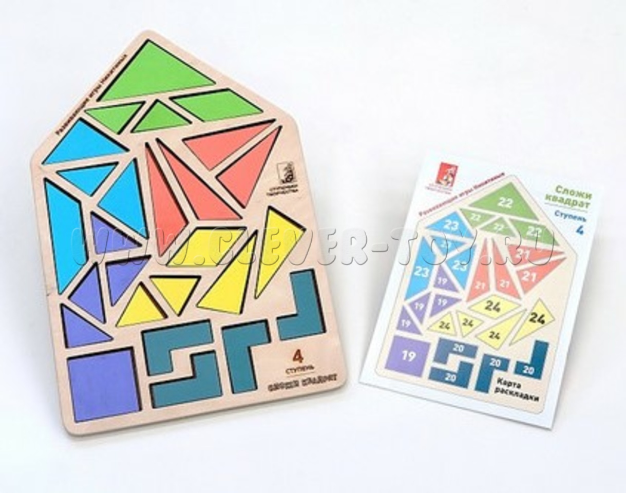 Деревянный планшет - "домик" - это методически правильная упаковка, где фрагменты квадратов хранятся в разобранном виде, что позволяет детям проявлять самостоятельность и творческое мышление.