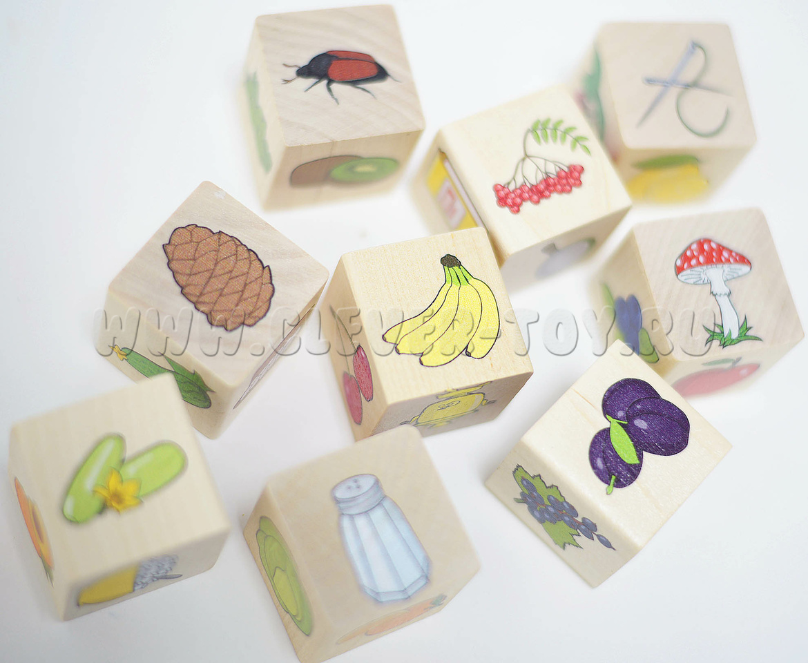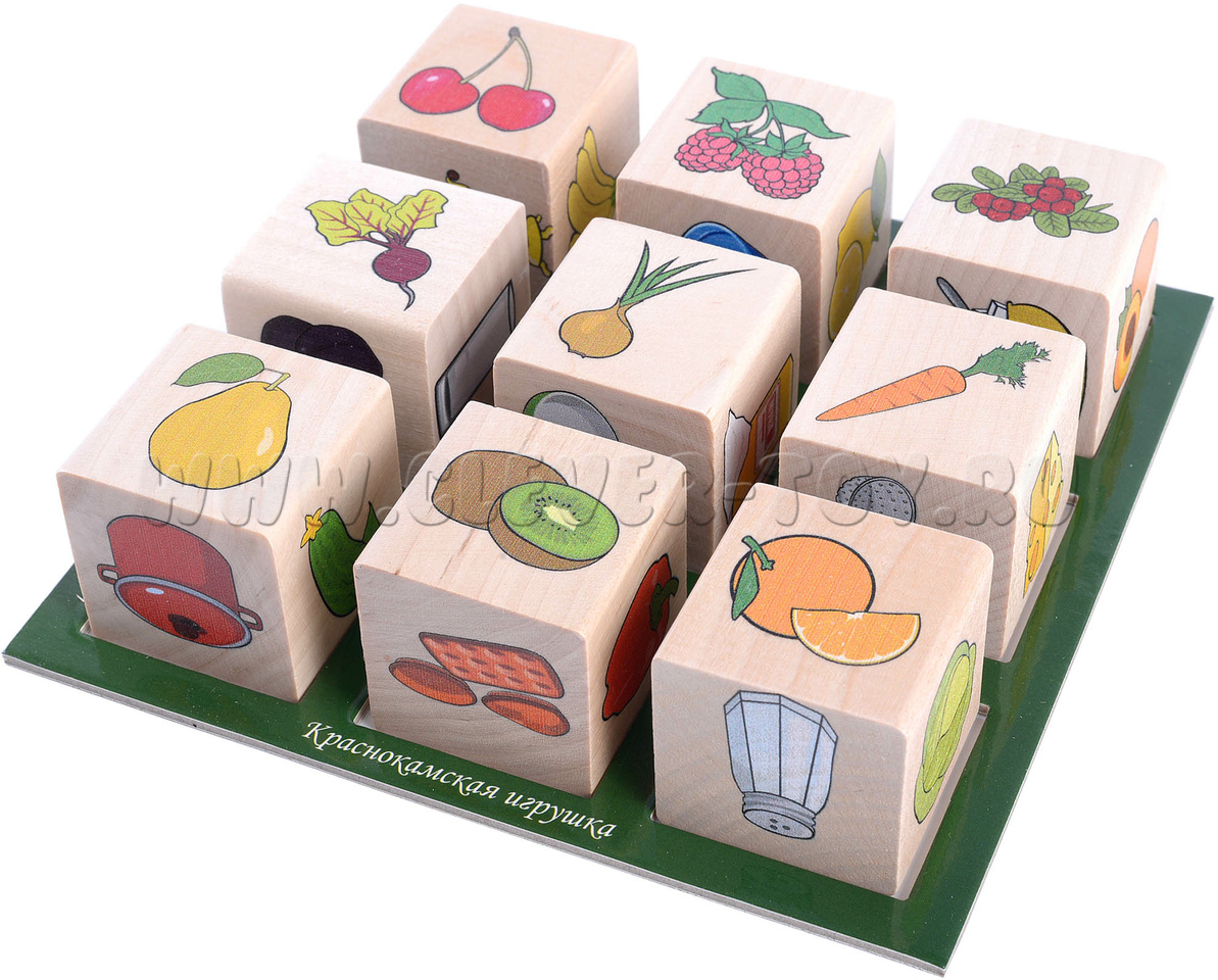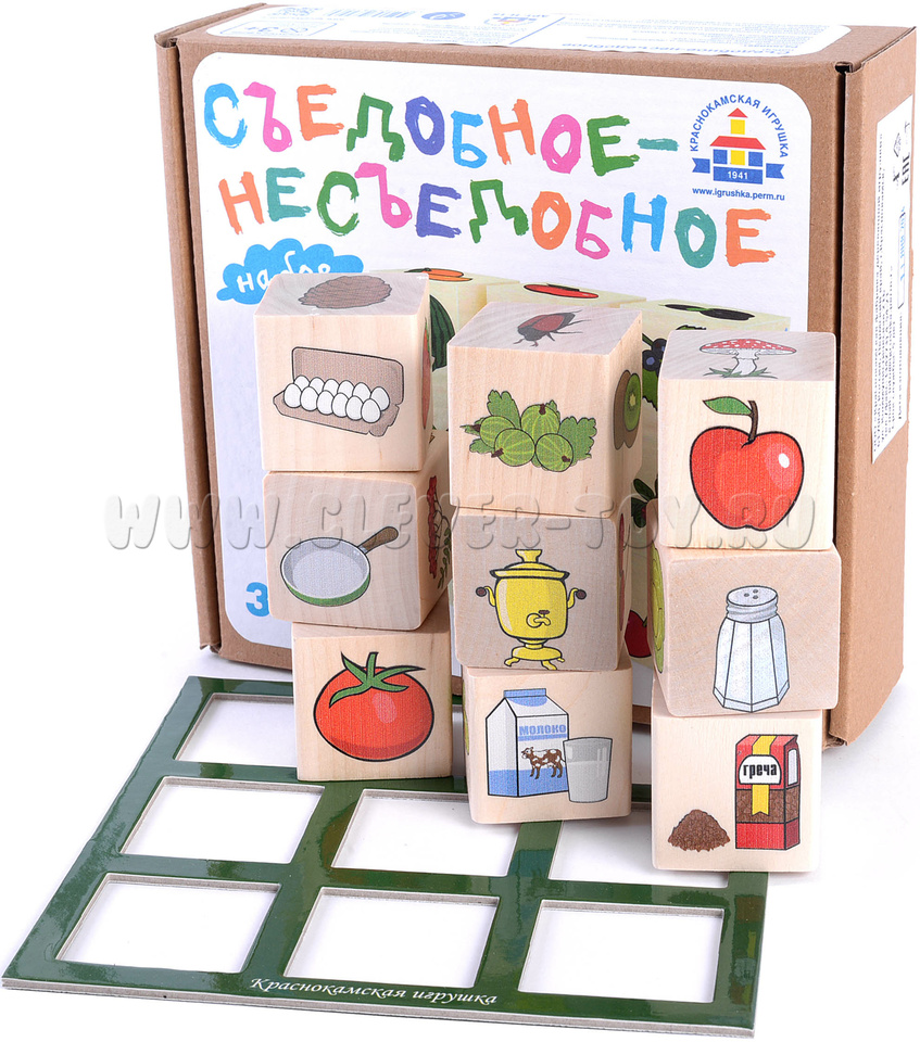 • 9 кубиков с изображениями продуктов питания и несъедобными предметами.