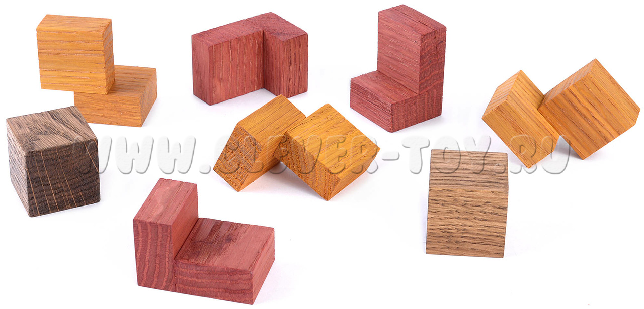 Гала куб состоит из 8 элементов и деревянной коробочки. Перед вами стоит две задачи. Сначала – упаковать все 8 элементов внутрь. А затем достать их выложить крест по толщине, равный ребру кубика.
