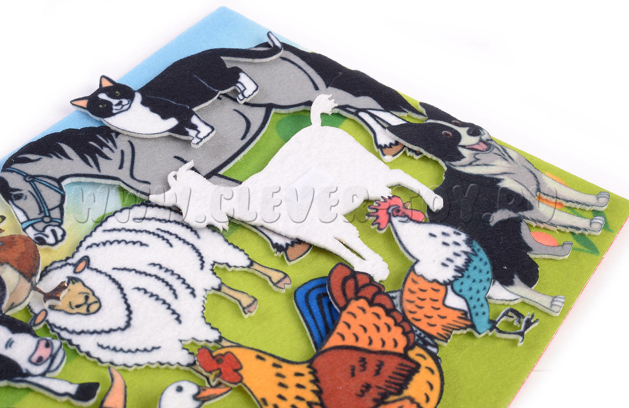 Развивающая игра-конструктор из фетра "Ферма". Комплектация: Набор из 13 фигурок домашних животных, Игровое поле с карманом 20*30см. Материал: фетр.
