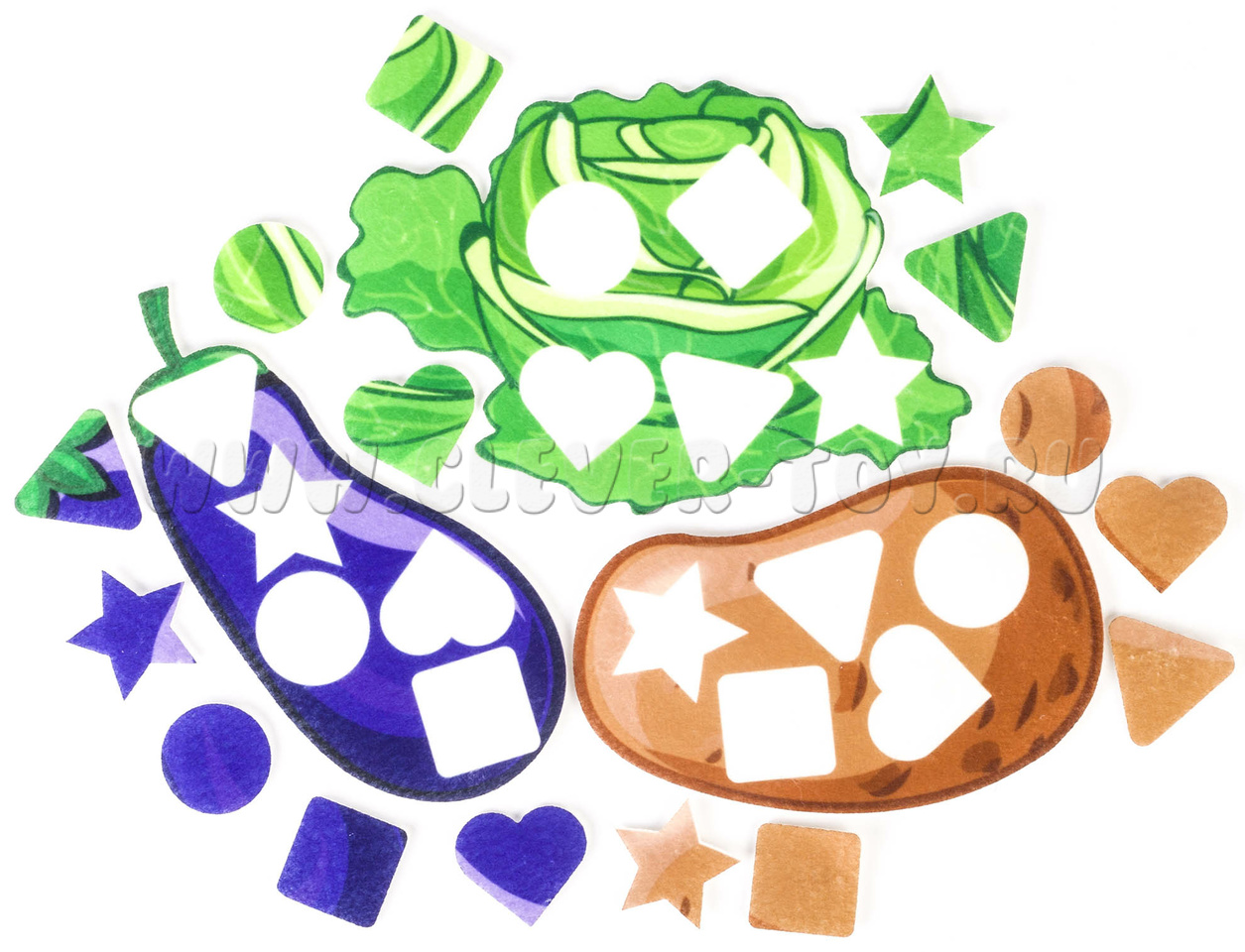 - маленькие фигурки на липучках, звезда, треугольник, квадрат, круг и сердце (по 5 фигур на каждый фрукт).