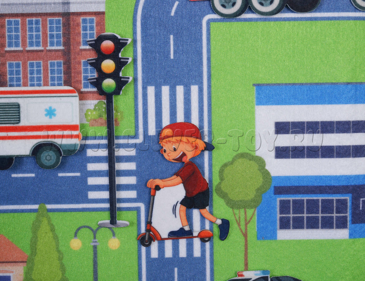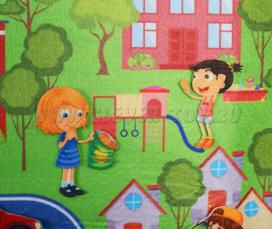 - игровое поле большого размера, выполненное в виде коврика с нарисованным на нём городом с дорогами, мостами, деревьями, зданиями;