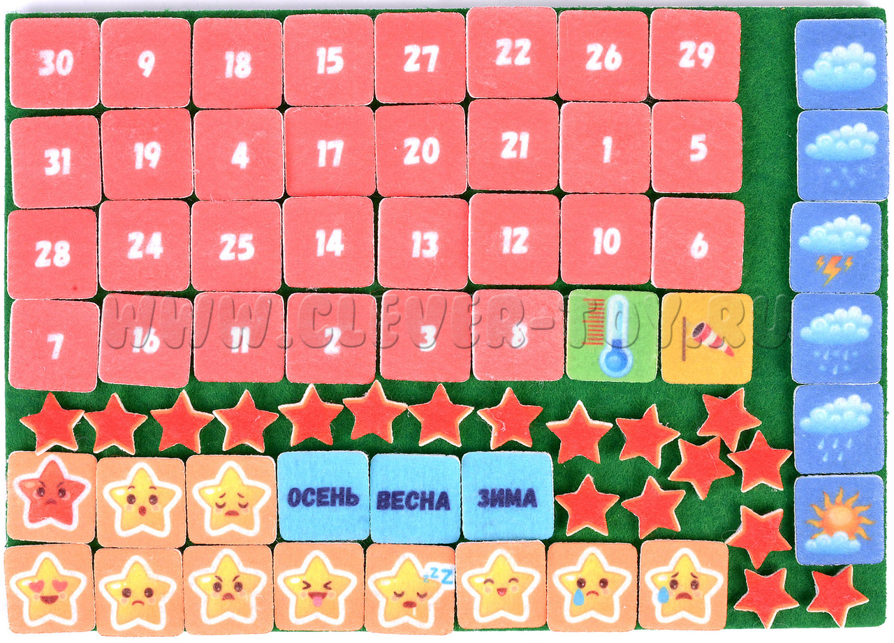 - Набор из 110 деталей (эмоции, осадки, ветер, температура, цифры, дни недели, месяцы, сезоны, распорядок дня, звездочки),