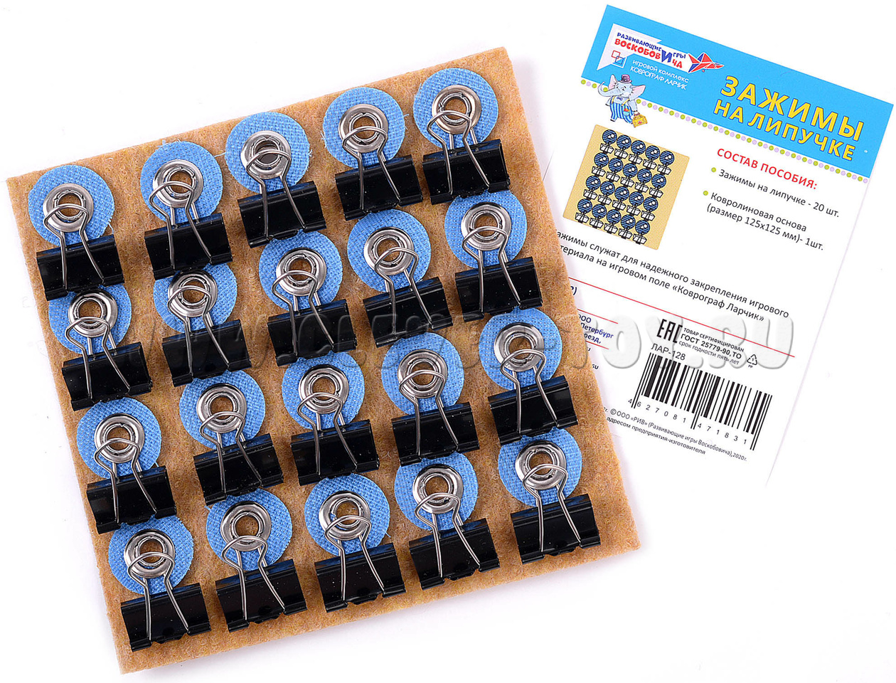 Зажимы на липучке – вспомогательный элемент набора "Коврограф Ларчик". Служит для надёжного закрепления игрового материала на игровом поле. Обеспечивают наглядность во время игр и занятий, а также обеспечивают динамизм подачи материала.