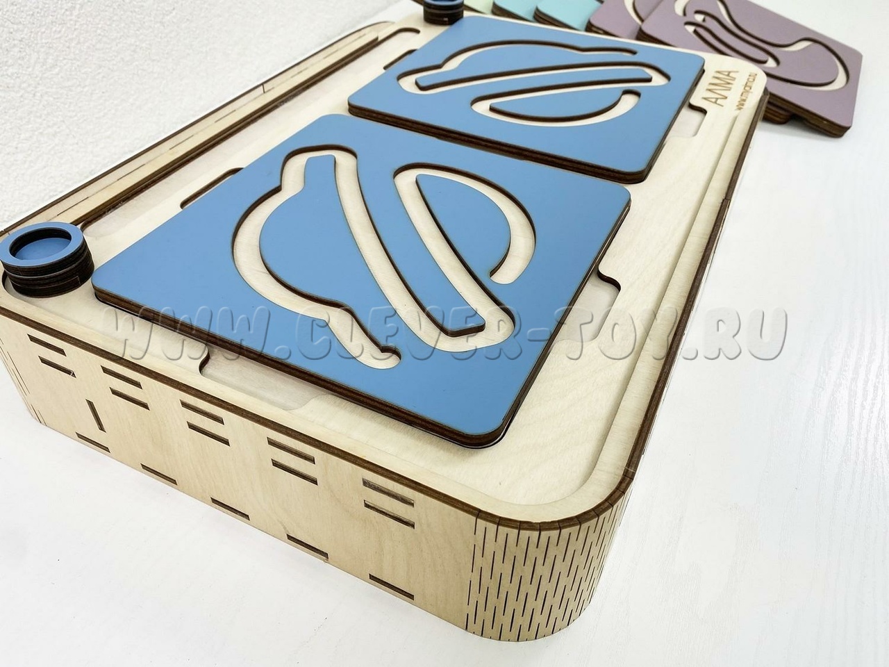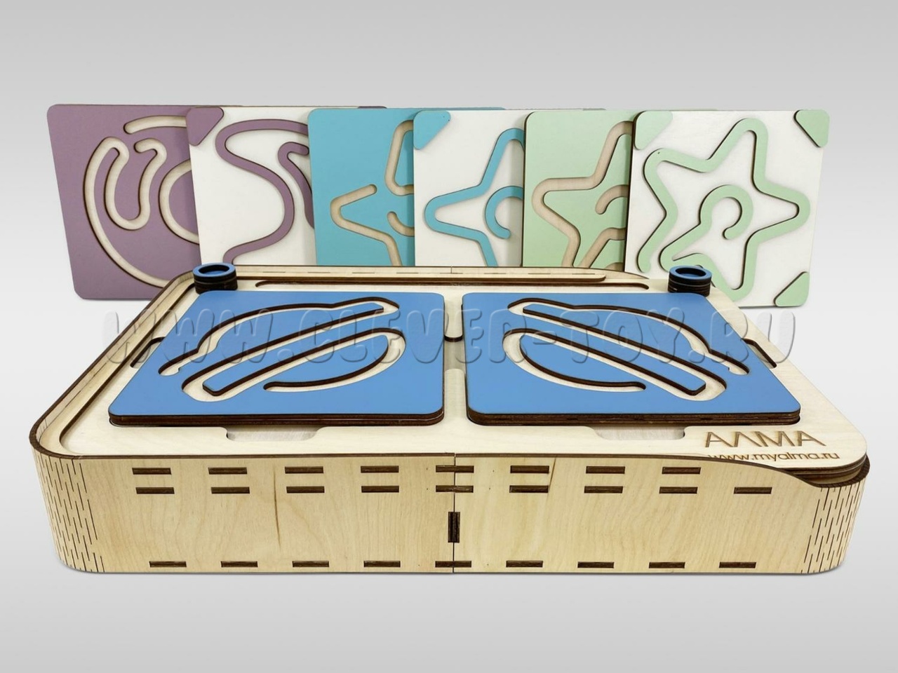 Два лабиринта с изображениями, расположенными симметрично, вставляются в пазы, и ребёнок проходит их с помощью специальных пальчиковых фишек.