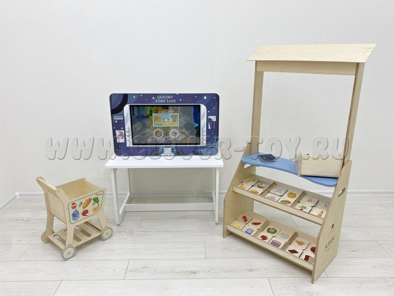 - Дополнительная атрибутика (детский киоск "Магазин" с кассой, тележкой и продуктами, макеты денег и пластиковых карт, копилки, кошельки, наборы для игры в группе на тему уроков).