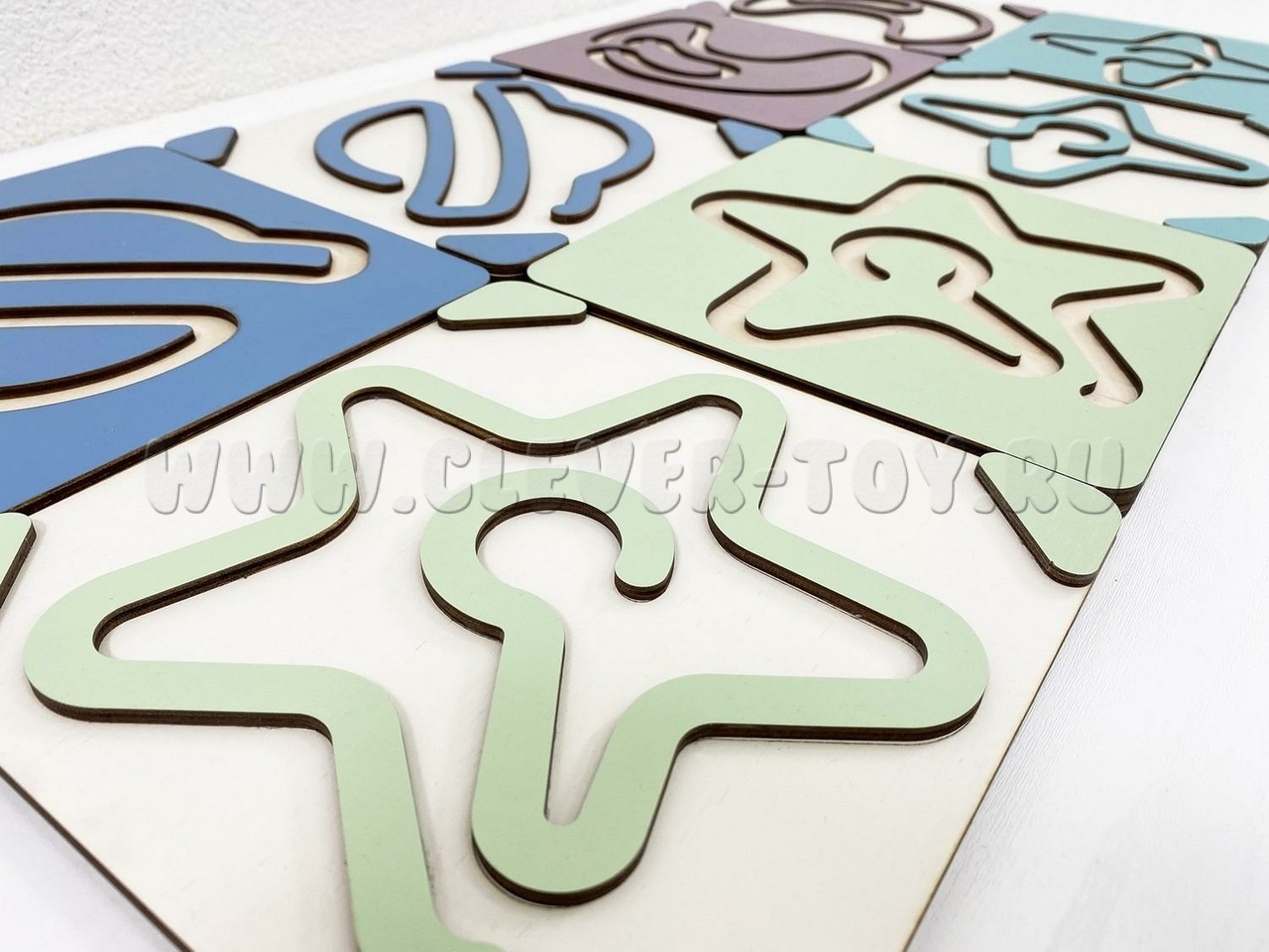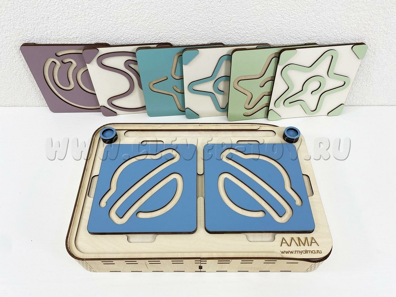 Два лабиринта с изображениями, расположенными симметрично, вставляются в пазы, и ребёнок проходит их с помощью специальных пальчиковых фишек.