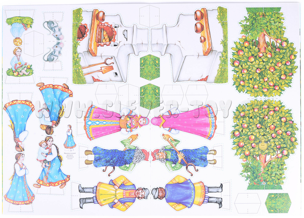 - Действующих персонажей выполненных из плотного картона, созданных для показа настольного театра. Средний размер персонажей, составляет 12 см. (Задача ребенка состоит в том, что нужно вырезать по пунктирным линиям 7 персонажей печку, яблоню, лес, избушку и склеить их);