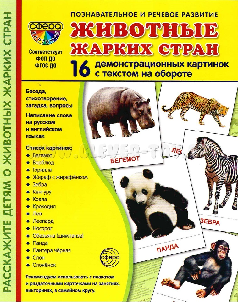 16 демонстрационных картинок для познавательного и речевого развития. На обороте каждой предметной картинки - описание, стихотворение, загадка, вопросы для ребёнка, название на русском и английском языках.