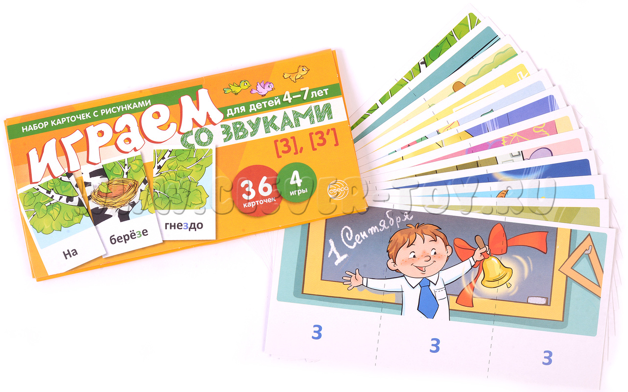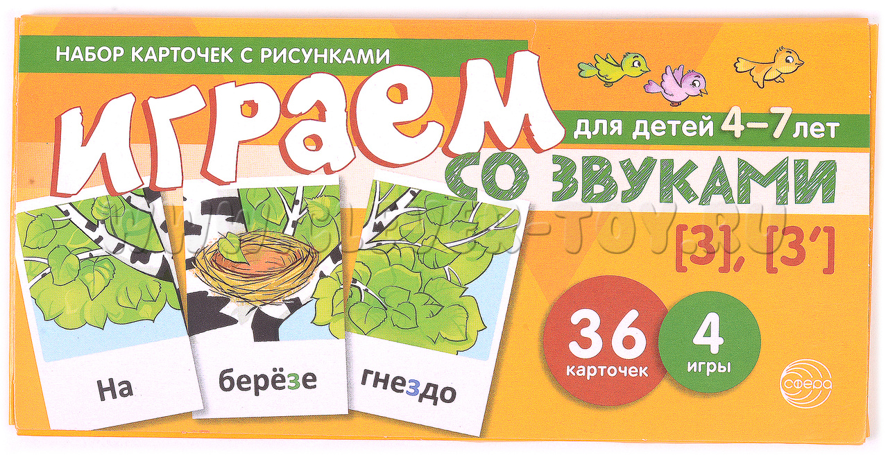 Это издание предназначено для обучения детей чтению в возрасте от 4 до 7 лет и включает в себя 12 обучающих картинок, состоящих из 36 карточек и 4 увлекательных игр. Оно является продолжением тематического комплекта "Играем со звуками. Звуки [с], [с']".