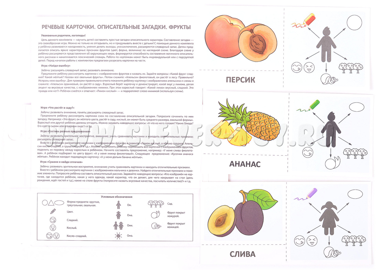 Комплект "Речевые карточки. Описательные загадки. Фрукты" представляет собой 12 листов, состоящих из 35 карточек и 4 игр.