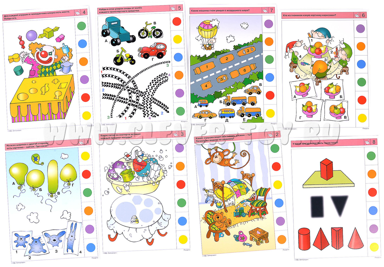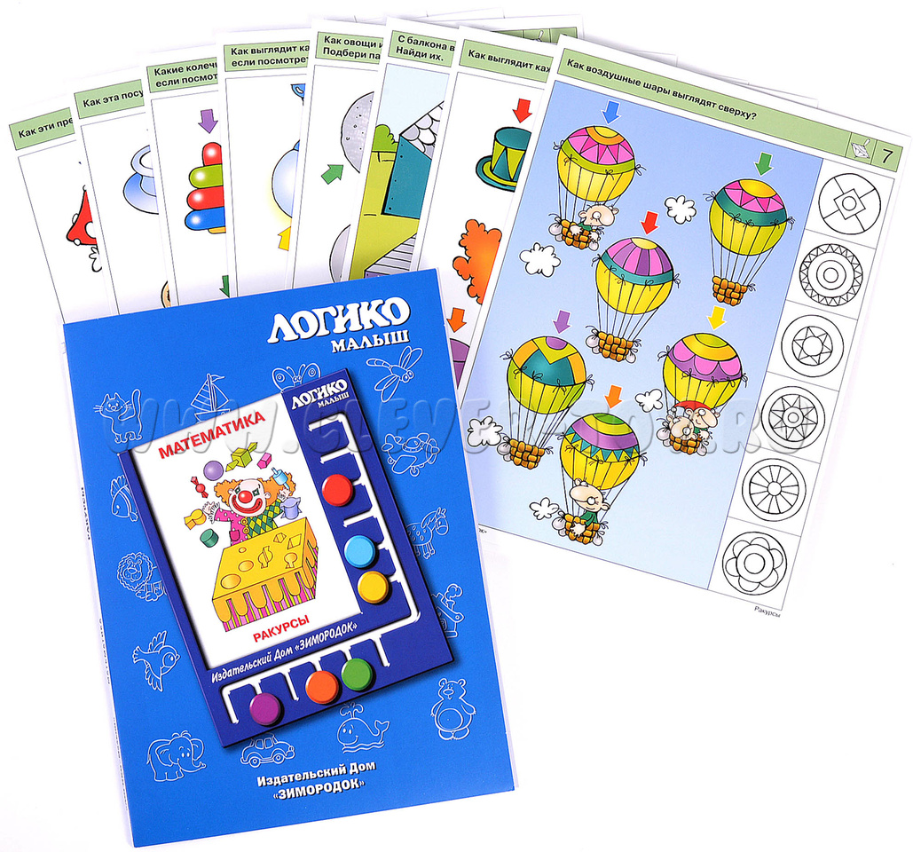 Задания комплекта направлены на развитие пространственного мышления, воображения и даже интуиции, ведь «геометрическое мышление» является образным, чувственным мышлением. Ребёнок научится угадывать, как будут выглядеть предметы с разных сторон, обратит внимание на то, что некоторые объёмные предметы сверху или сбоку похожи на плоские геометрические фигуры. Примеры заданий в карточках: 1а. Как эти предметы выглядят сверху? 2б. Какие игрушки видит обезьянка, а какие – ты? Почему вы видите по-разному? 4а. Как каждая шляпа клоуна выглядит сверху? 5б. Найди в этих узорах следы от колёс каждого транспортного средства. 7б. Какие машины гном увидел с воздушного шара?