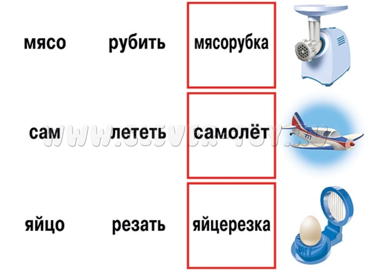 - Раздайте детям карточки со словами в красных рамках. Им необходимо подбрать подходящую к слову картинку и два слова-основы, из которых составлено слово в рамке;