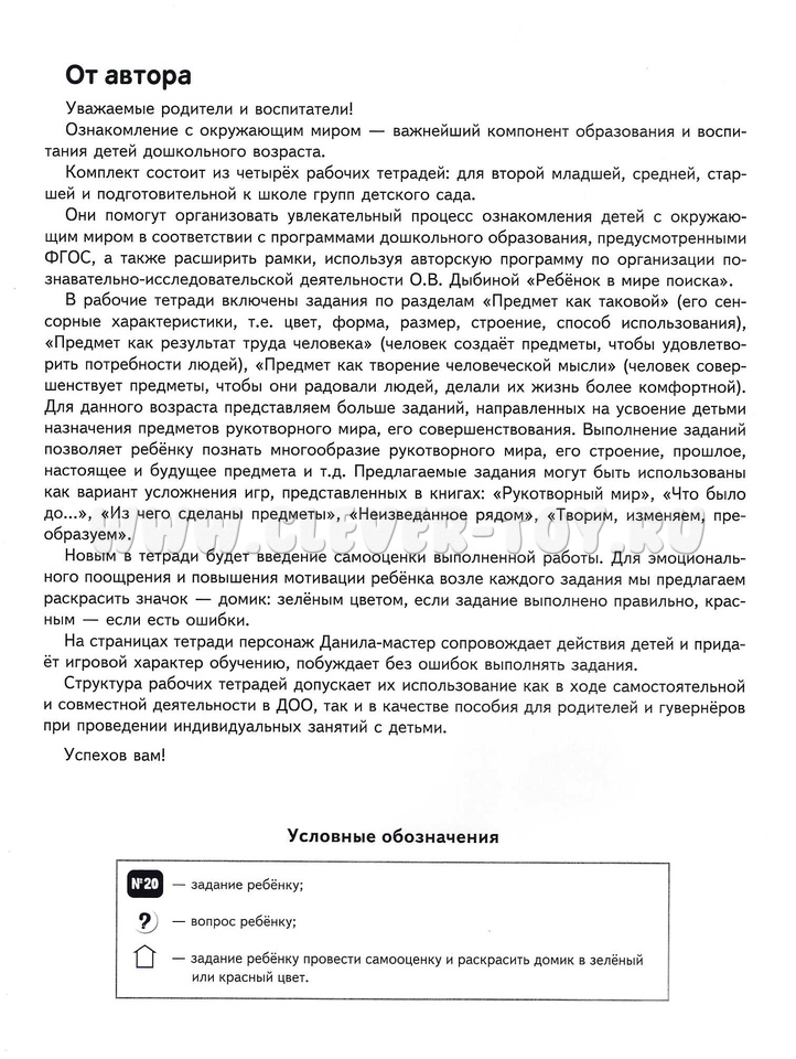 В пособии представлены задания и практикумы по ознакомлению с рукотворным миром, природой и историей происхождения предметов. Плюсы цветных тетрадей О.В. Дыбиной "Я узнаю мир" (серия "Ребенок в мире поиска"):