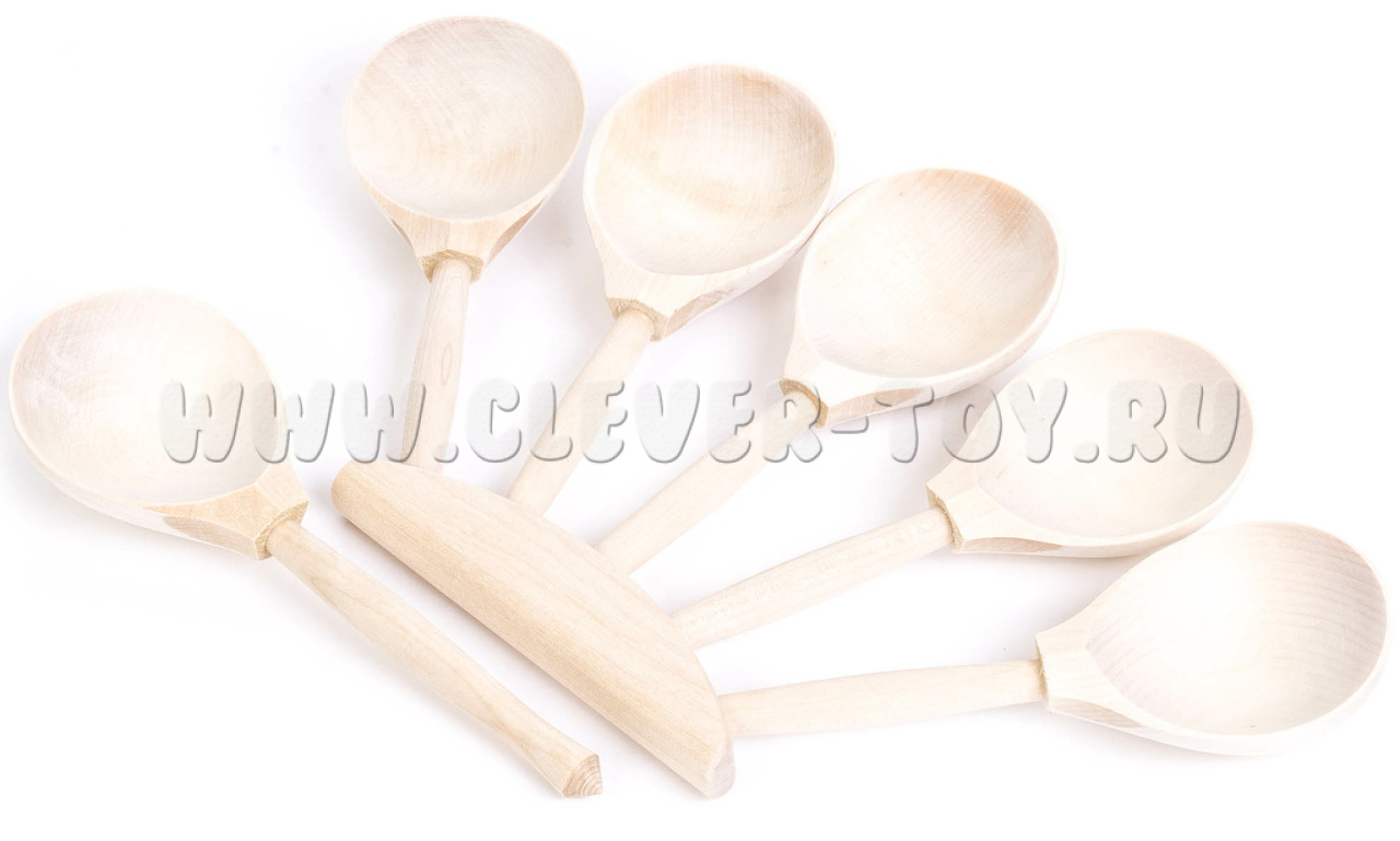 Пять деревянных ложек закреплены на бруске. Толщина бруска 15 мм, длина 130 мм, ширина 30 мм. На бруске ложки располагаются под углом в 22 градуса и на расстоянии 35 мм друг от друга. В основание бруска ложки крепятся с помощью клея. В комплект музыкального инструмента входит еще одна ложка - игровая. Представляет собой обычную музыкальную ложку. Материал: береза.