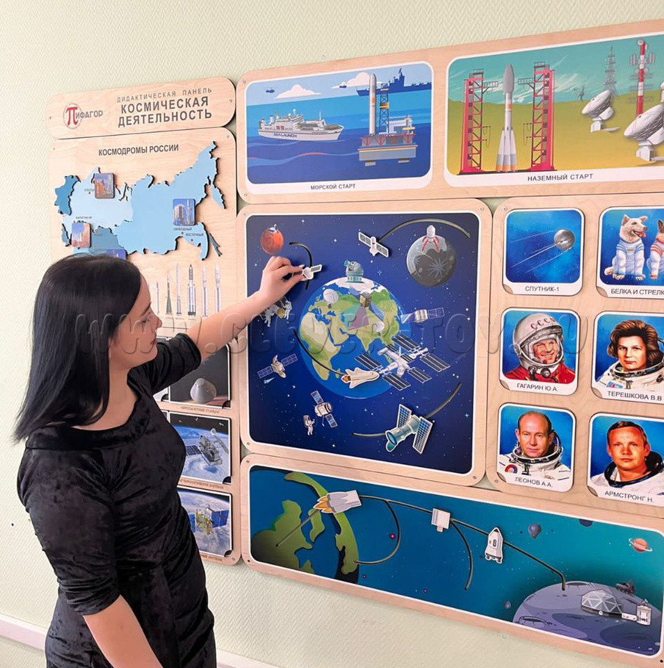 Дидактическая панель "Космическая деятельность" знакомит детей не просто с космосом как красивой темой, а с космической деятельностью человечества как важной областью науки, техники и современной жизни.